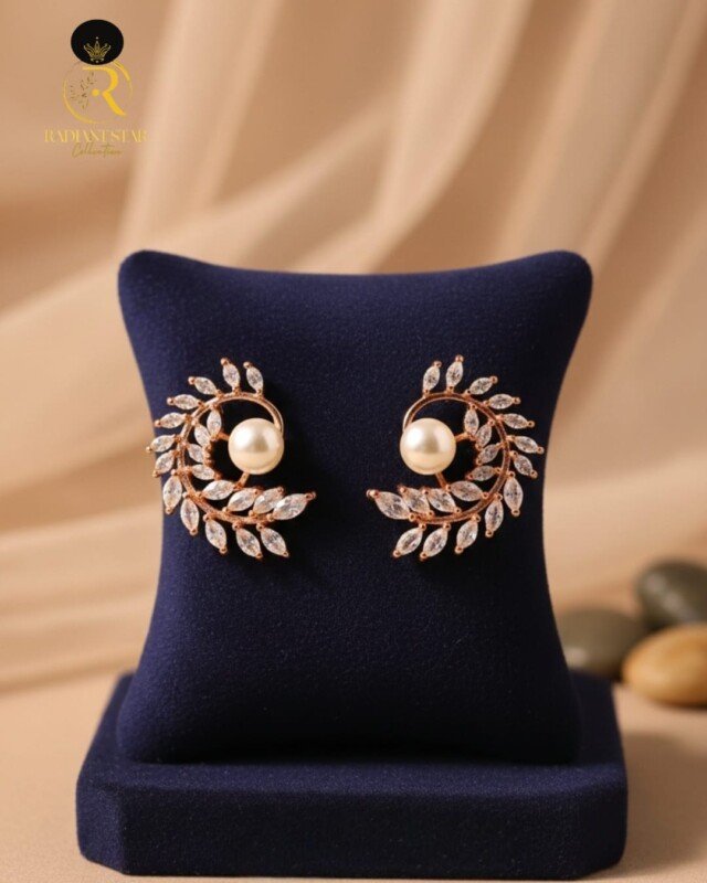 Elevate your elegance with these exquisite spiral pearl earrings from the Radiant Star Collection. Designed with a luxurious rose-gold finish, each earring features a luminous pearl at the center surrounded by sparkling marquise-cut stones arranged like delicate leaves. Perfect for weddings, parties, and festive occasions, these earrings add a touch of sophistication and timeless charm to any outfit.